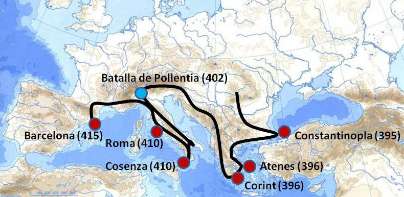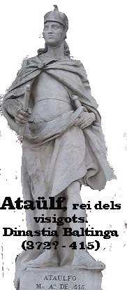 Després de saquejar Roma al 410, els visigots segueixen el seu camí i arriben a Barcelona al 415. Abans però, estableixen la seva capital a Tolosa. Ataülf n'era el rei i s'havia casat amb Gal·la Plàcida, germana de l'emperador Honori. Però l'alegria li va durar poc, i va ser assassinat a Barcino en el transcurs del mateix any. Amb tot, el poder real el continuava tenint l'emperador romà, i els visigots n'eren aliats. Amb aquesta coalició vàren fer front a alans, sueus i vàndals durant desenes d'anys. Poc després, sobre el 472, els visigots entren amb dos exèrcits per ambdós costats del Pirineu i assoleixen el poder i exhaureixen definitivament l'època romana. En aquest moment Hildifred consolida el domini a Tarraco. Anys més tard i després de les pressions a les que els francs van sotmentre als visigots, els quals es van veure expulsats de Tolosa, tot i tenir encara possessions al nord del Pirineu, la capitalitat va recaure sobre Barcelona. |