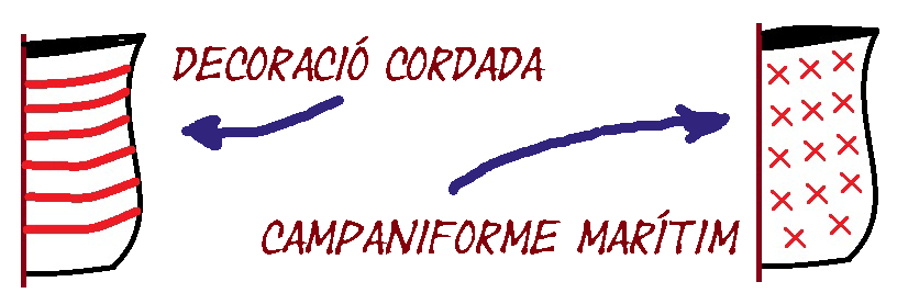 En aquest sentit esmentaré les tipologies que s'ha trobat a casa nostra. Les dues primeres composen juntes el que s'anomena campaniforme internacional, doncs són els que tenen més abats cronològic i geogràfic entre el 2.400 i el 2.100 a.n.e. * En primer lloc la ceràmica cordada, la qual s'efectua sobre tot el vas suggerint una sèrie de cordons o ratlles horitzontals. * El següent, pràcticament amb la mateixa cronologia, és l'anomentat campaniforme marítim, amb una decoració formada per bandes incises. De forma regional es troben altres decoracions com la Pirenaica o la Salomó que amplñien les morfologies amb bols, tasses...amb motius impressos i incisos diversos. |