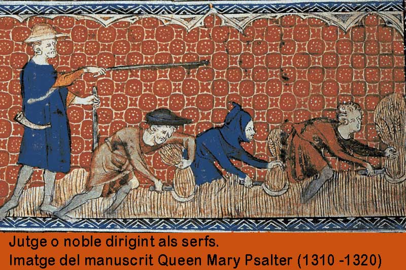 Els camperols: no són vassalls. Els senyors feudals, poc a poc, s'atribueixen funcions públiques que anteriorment posseïen els comtes, i els nous camperols, a més de no tenir la propietat de la terra (normalment), han de pagar una renda, que de vegades és superior a l'excedent que puguin generar. Però de contractes n'hi ha diversos. Per exemple n'hi ha un en que propietari i arrendatari comparteixen gastos i beneficis, però també hi ha camperols que no només no tenen gaires drets, si no que a més, estan adscrits a la terra, si la terra passa de mans, el camperol canvia de senyor. Finalment hi ha el Remença, un tipus de contracte en el que el camperol pot abandonar les terres pagant per ell i per tota la seva família al seu senyor. Al segle XIV un terç dels camperols catalans tenen aquest tipus de contracte. En definitiva, la societat feudal està més en mans de la nova noblesa (antiga aristocràcia) que dels comtes i reis. Aquesta noblesa acumularà terres i rendes molt superiors a les del mateix comte, i tindrà al seu servei a camperols i artesans. |