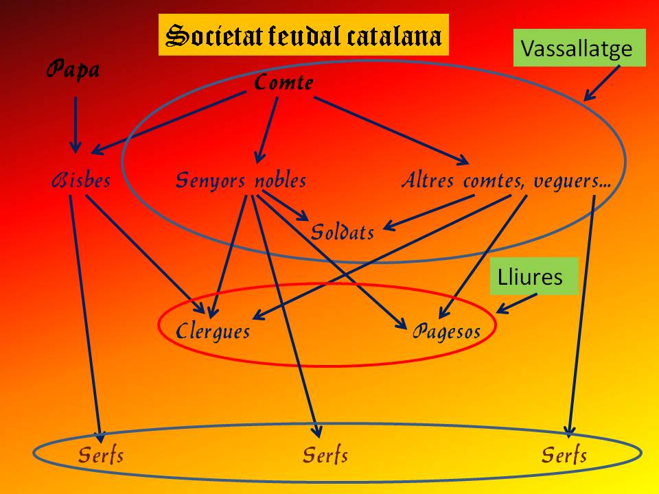 El feudalisme Es tracta d'un sistema socio-polític-econòmic que té els seus orígens en els segles VIII i IX, però que no és plenament efectiu i reconegut fins a mitjans del segle X. Aquest té la facultat de dotar d'uns poders exclusius, i gairabé ilimitats, a unes clases superios que viuran de la feina i les rendes de la resta de la població. És la conseqüència de que el rei o comte no tingui prou ingressos (o excessius gastos) i per això entregui terres i poder a altres nobles inferiors, els quals a canvi, li proporcionaran l'ajuda econòmica i humanitària que li calgui. Aquest canvi de forces proporcionarà diversos efectes en la societat medieval. |